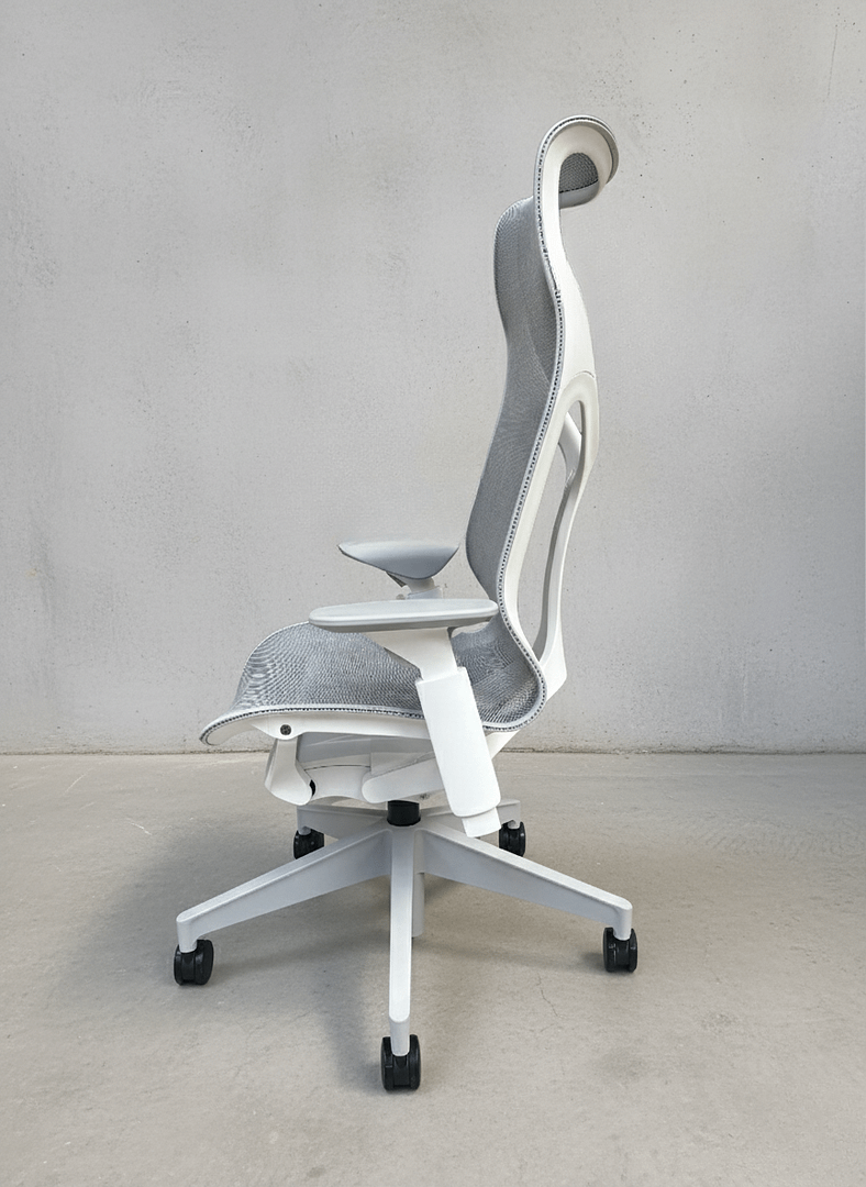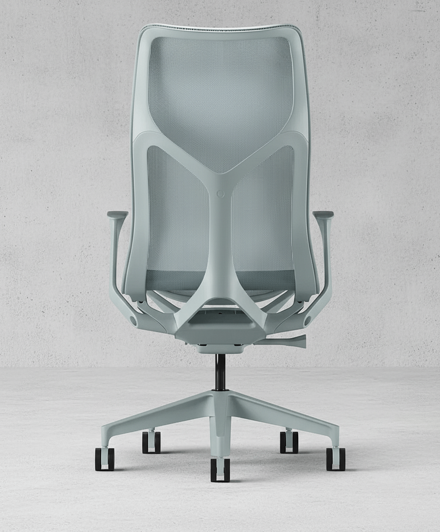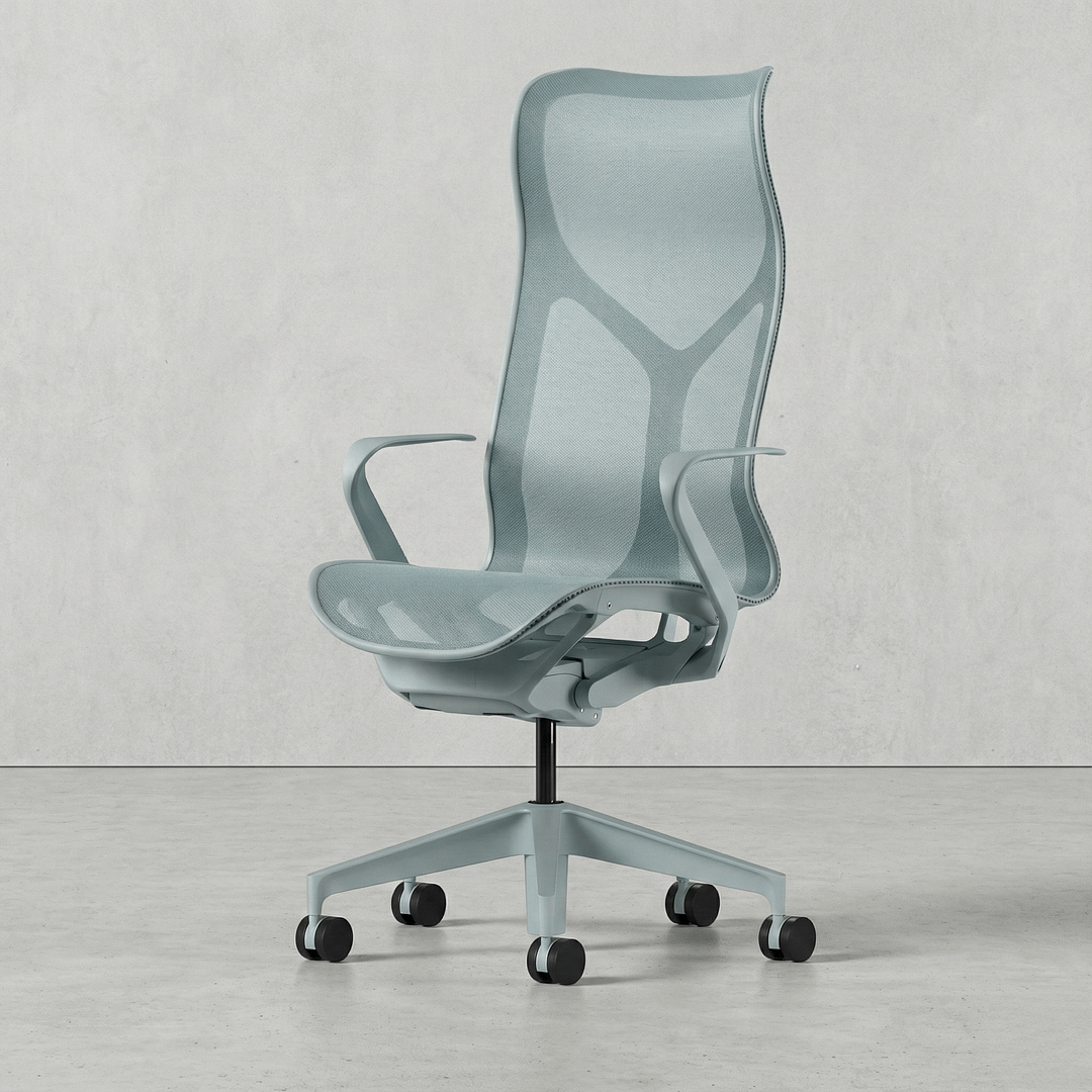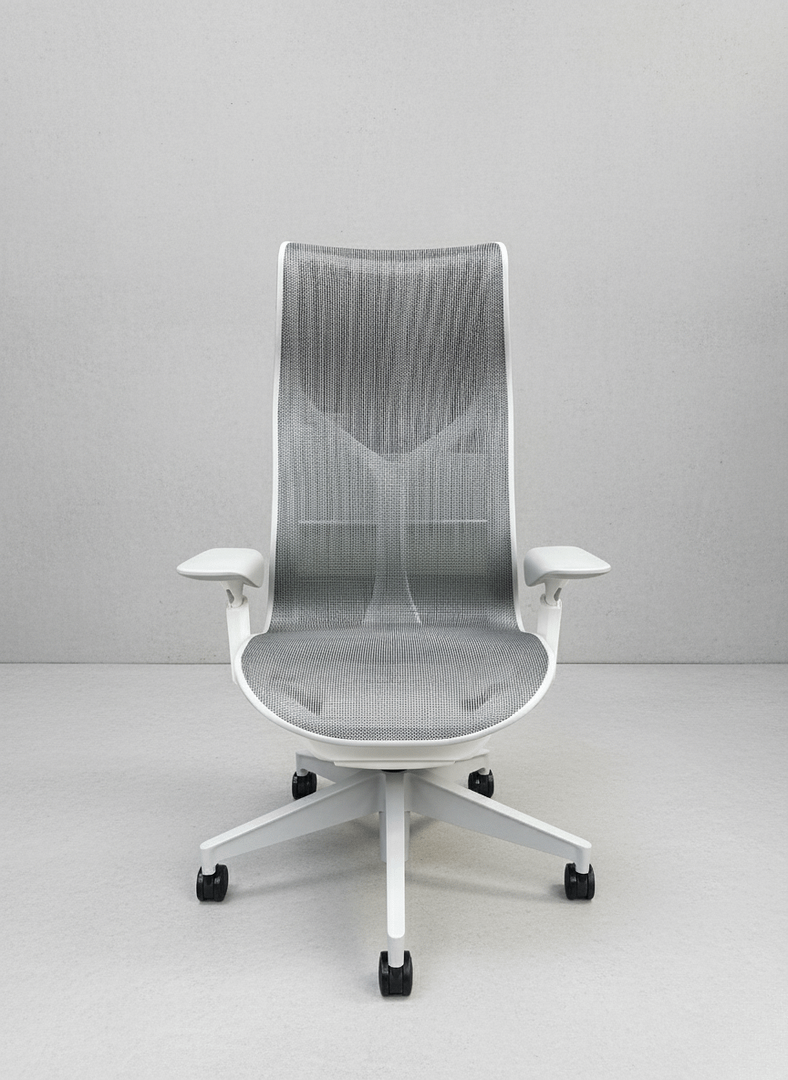 The Herman Miller Cosm with high backseat is a chair designed to deliver immediate comfort without the need for adjustments. Its purpose is to make sitting as effortless as possible – you simply sit down, and the chair automatically adapts to your body. Unlike many other office chairs, the Cosm requires no complex fine-tuning, as it intuitively responds to movement and changes in posture. The seat and back are made from a continuous elastomeric mesh that distributes weight evenly, allows air to flow, and provides consistent support throughout the day. Its slim, flexible frame moves with you, eliminating hard edges and encouraging natural freedom of motion.