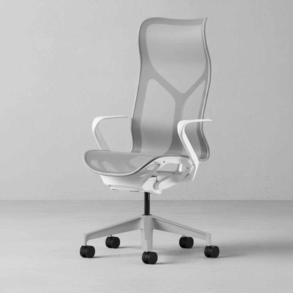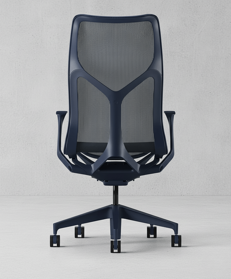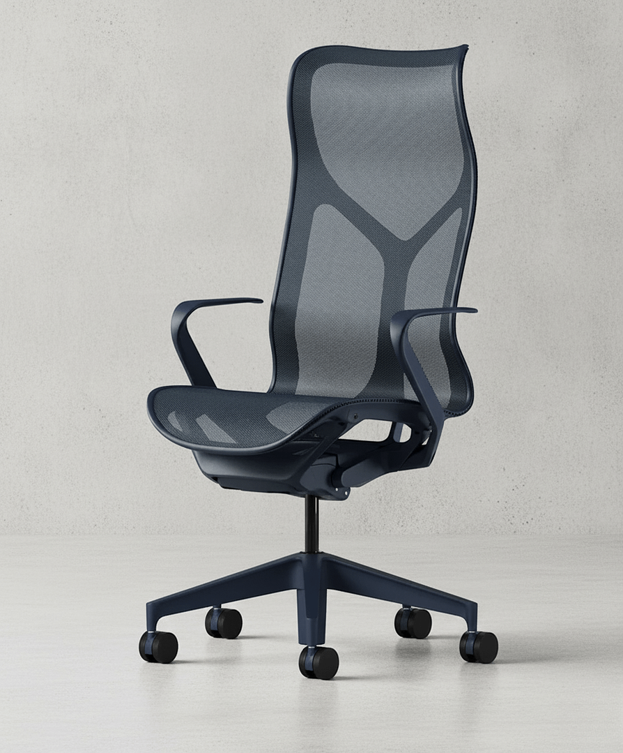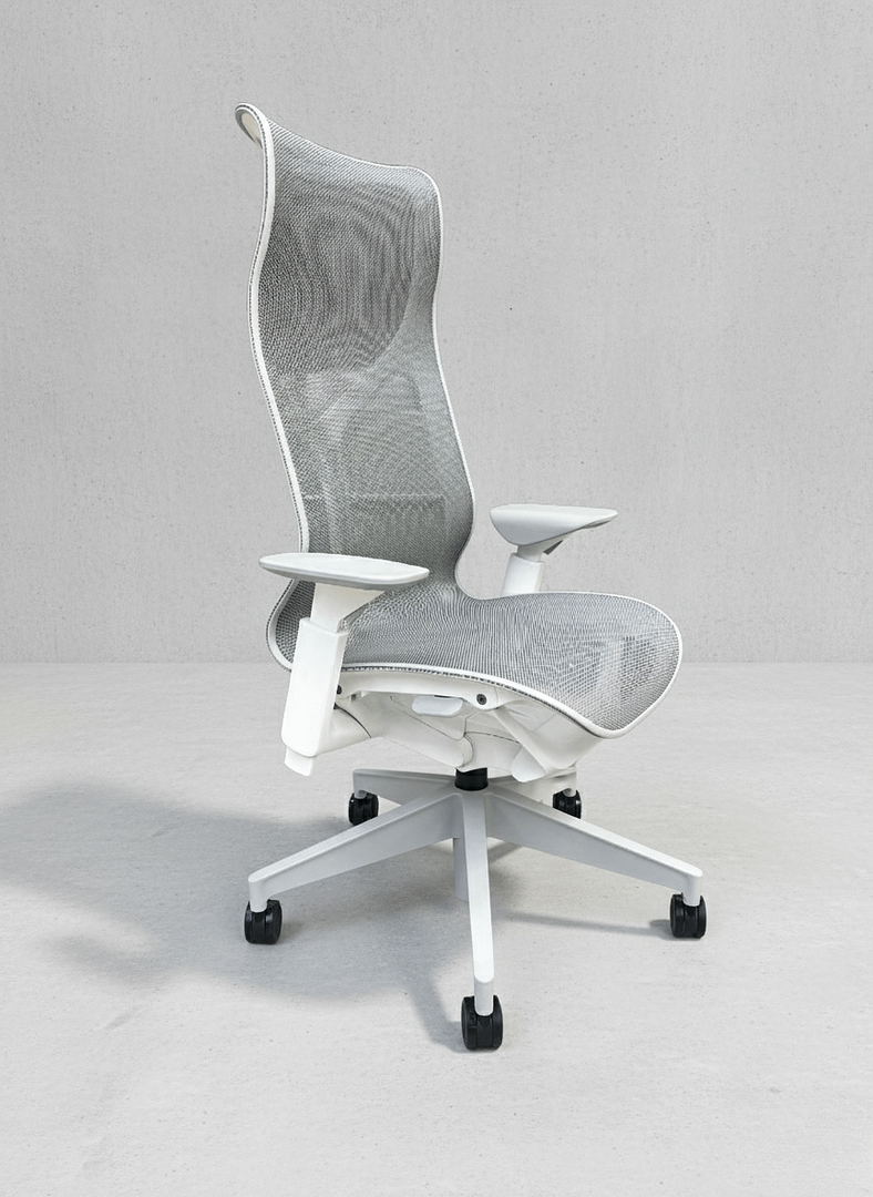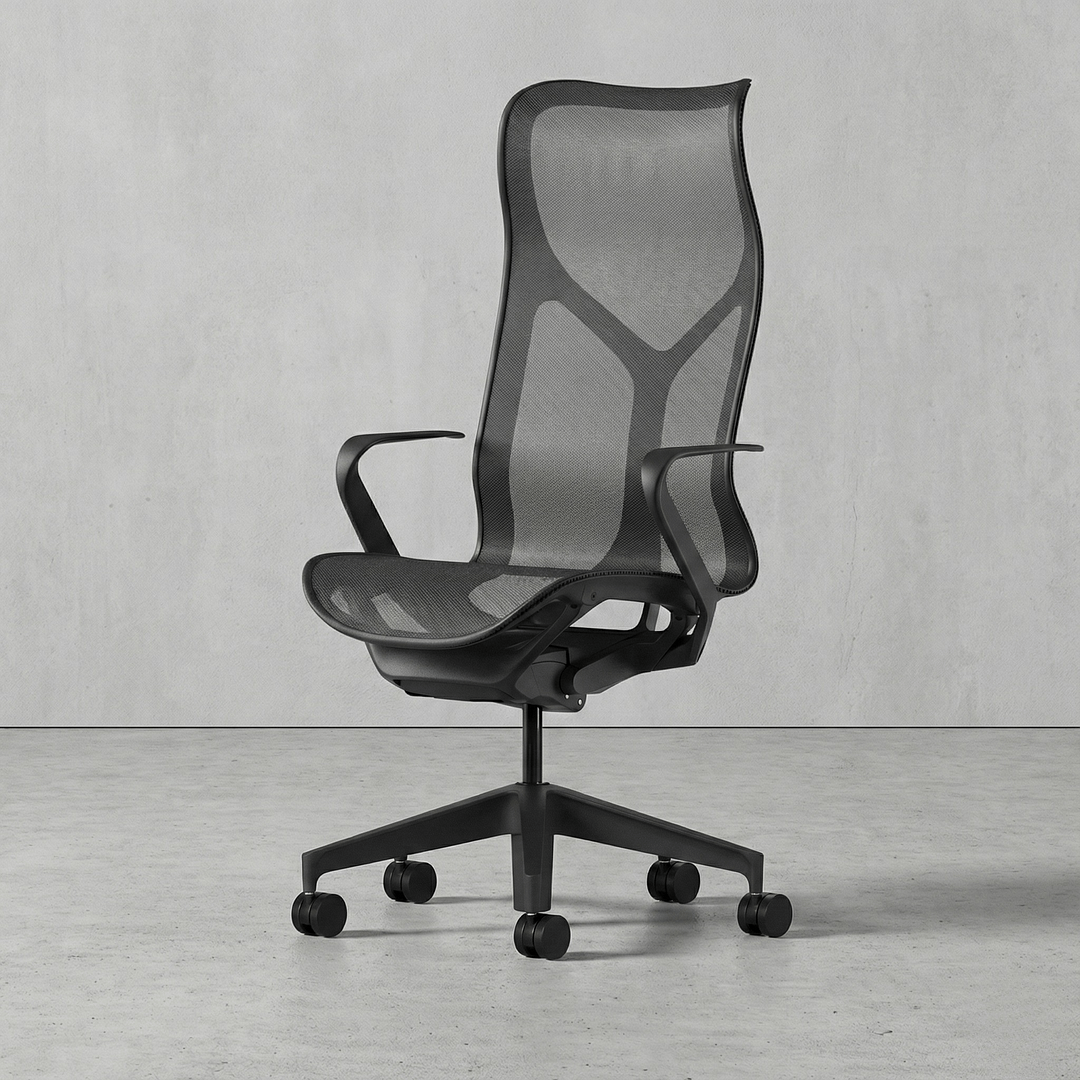 The Herman Miller Cosm with high backseat is a chair designed to deliver immediate comfort without the need for adjustments. Its purpose is to make sitting as effortless as possible – you simply sit down, and the chair automatically adapts to your body. Unlike many other office chairs, the Cosm requires no complex fine-tuning, as it intuitively responds to movement and changes in posture. The seat and back are made from a continuous elastomeric mesh that distributes weight evenly, allows air to flow, and provides consistent support throughout the day. Its slim, flexible frame moves with you, eliminating hard edges and encouraging natural freedom of motion.